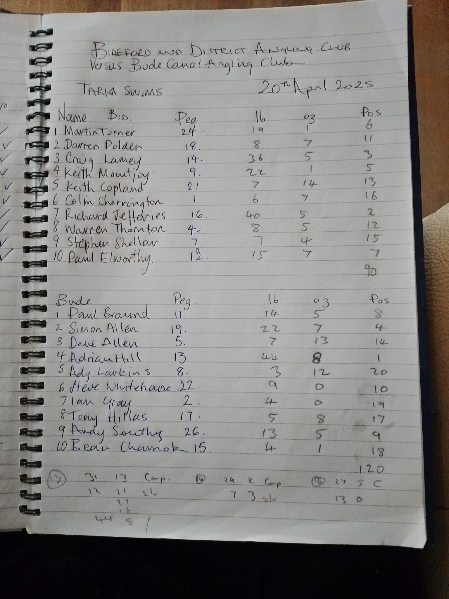 Overall team total Bideford 120pts - Bude 90pts